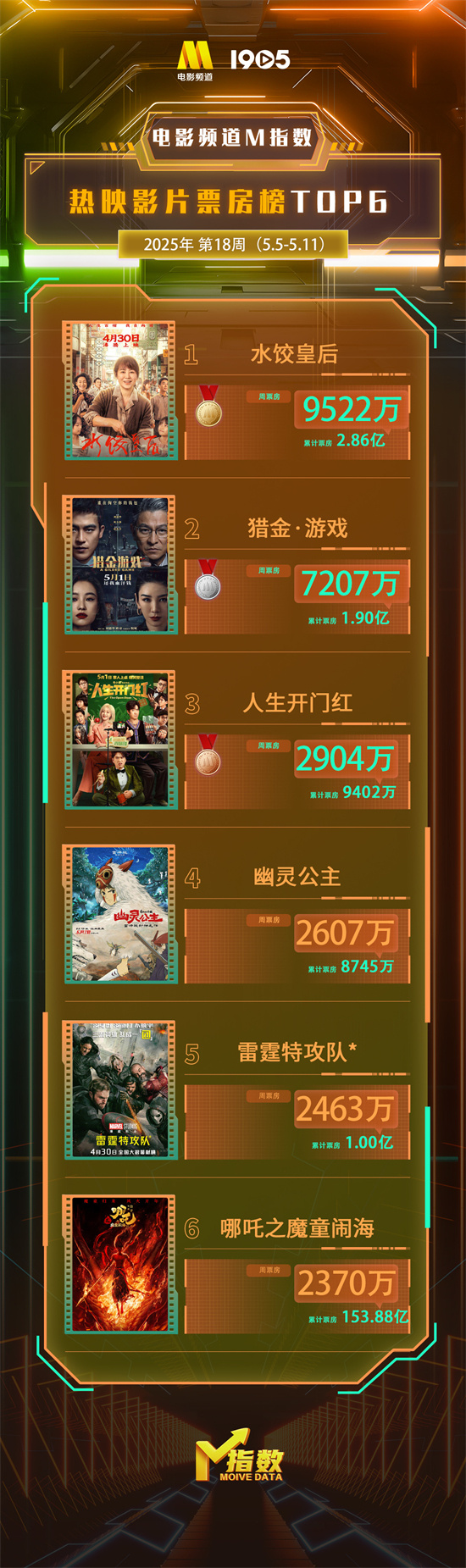 1905电影网讯 “电影频道M指数”2025年第18周结果发布。5月5日-5月11日,“电影频道M指数”热映影片票房榜前6位依次为: