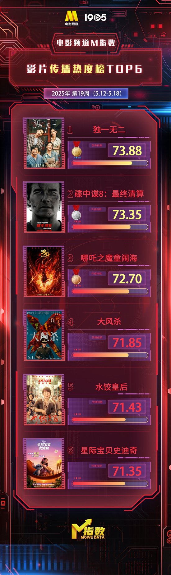 1905电影网讯 “电影频道M指数”2025年第19周结果发布。5月12日-5月18日,“电影频道M指数”热映影片传播热度榜前6位依次为: