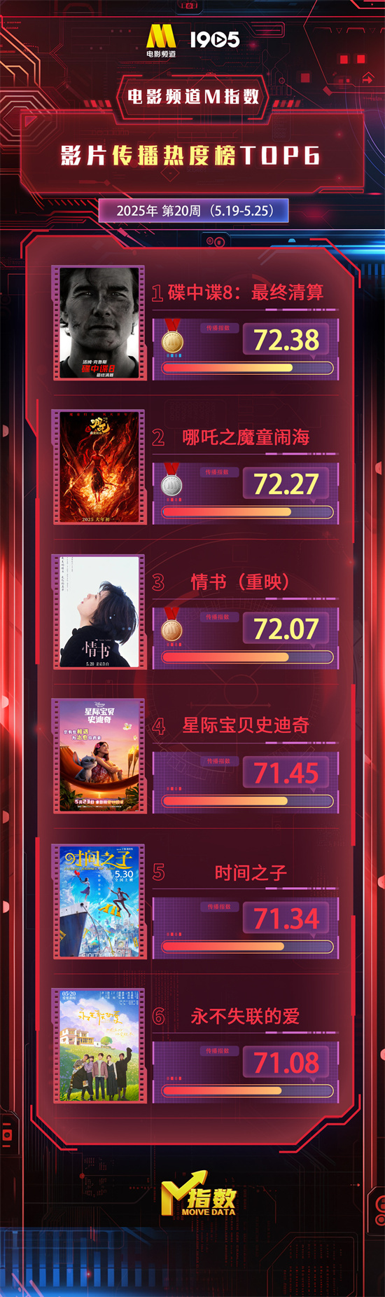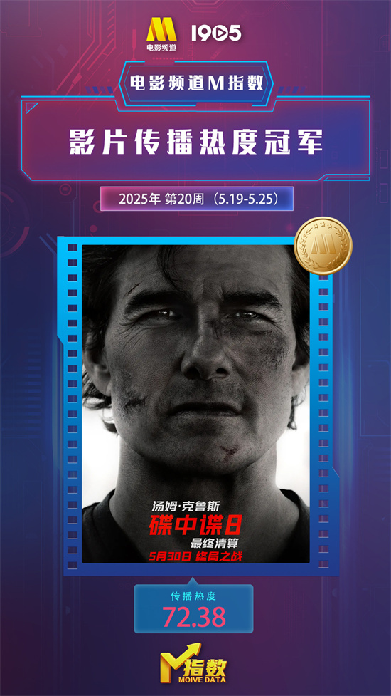 1905电影网讯 “电影频道M指数”2025年第20周结果发布。5月19日-5月25日,“电影频道M指数”热映影片传播热度榜前6位依次为: