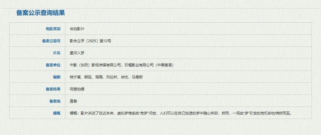1905电影网讯 据国家电影局最新备案、立项公示,电影《星河入梦》立项,编剧为钱宁黄、韩延、高璐、刘达林、徐忱、马佩斯,备案单位为中影(东阳)影视传媒有限公司、石榴影业有限公司(中国香港)。